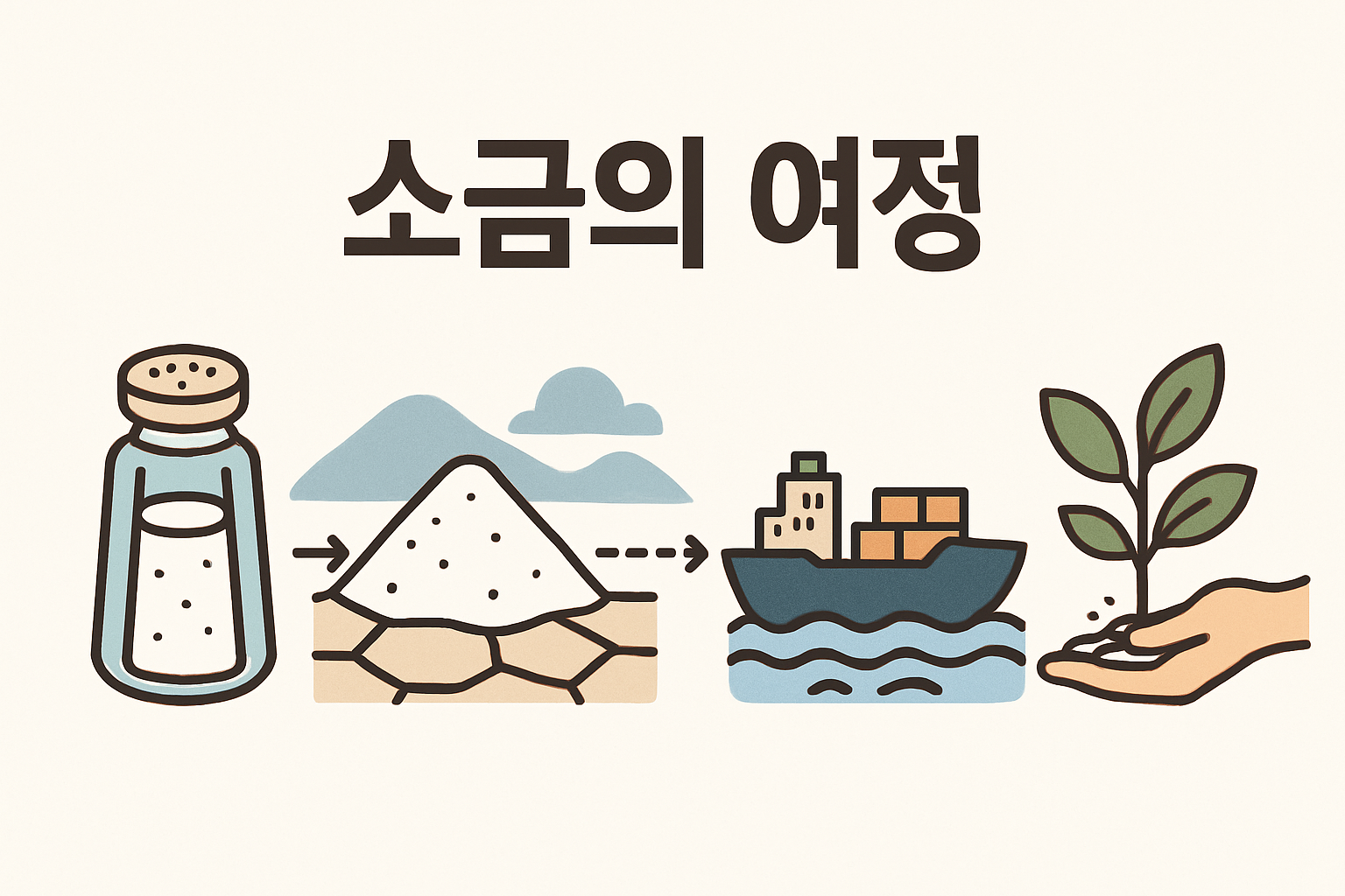 이 순환 시스템은 지구 생태계의 중요한 일부분으로, 바다와 육지, 대기 간의 상호작용 속에서 소금도 함께 움직이며 지구의 균형을 맞추고 있습니다.